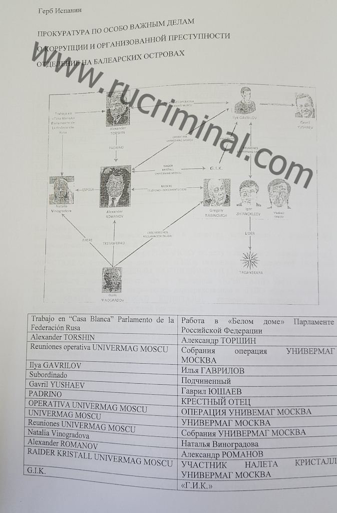 Сейчас и в Испании, и российские оперативники с интересом ожидают, чем закончится расследование дела об убийстве Янбухтина. Окажутся ли за решеткой его непосредственные боссы, лидеры таганской ОПГ Игорь Жирноклеев и Григорий Рабинович. Или им опять все сойдет с рук. За примерами далеко ходить не надо. В 2009 году киллеры расправились с заместителем руководителя юридической службы универмага «Москва» Андрея Бралюка. Произошло это в тот момент, когда Рабинович и Жирноклеев вели операцию по рейдерскому захвату «Универмага», а Бралюк, как сейчас Вавилина, очень мешал им. Убийство было фактически раскрыто. Существовали даже свидетельские показания о том, что с Бралюком расправились по распоряжению Жирноклеева и Рабиновича. Но они остались безнаказанными. Свою роль сыграли не только деньги, но и могущественные покровители таганской ОПГ. Двое из них, называются в «испанском досье». Согласно документам, padrino (крестными отцами) таганских являются нынешний зампредседателя ЦБ РФ Александр Торшин и авторитетный миллиардер Гавриил Юшваев, более известный в определенных кругах, как Гарик Махачкала. Первый курировал ОПГ через Александра Романова, а второй- через банкира Илью Гаврилова. Rucriminal.com публикует данные материалы испанцев, а также некоторые другие. Например, о других жертвах «таганских». Выясняется, что гангстеры имели отношение к устранению адвоката Айнара Платациса, а также планировали убийство владельца компании «Абитаре» гражданина США Фрэнка Ньюмена.